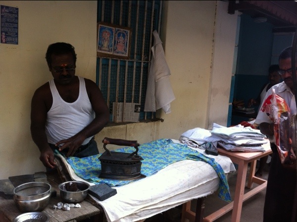 Ute på gatan där vi bor sitter mannen med sin trampsymaskin, han lagar klänningen för 10 Rp medan vi vandrar vidare till… Strykaren!