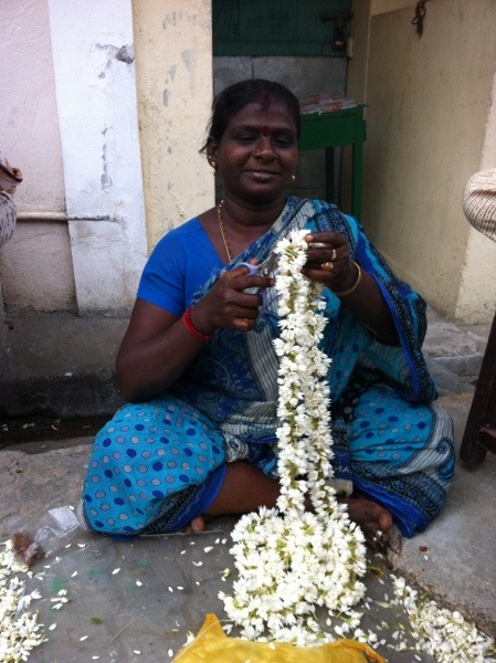 Blombindandet finner jag svindlande. Så oändligt många som måste plocka och binda blommor i det här landet. Varje tempel ska ha nya blommor, varje dag. Här i södra Indien är det mest den fantastiska jasminen som används till blomband, otrolig doft. I norr är det oftast tagetes.