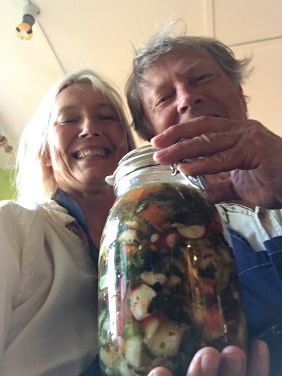 När vi väl kollat olika recept inser man att det kan verkligen göras på många sätt o olika ingredienser. Men en vanlig bas verkar vara salladskål, så har vi också gjort… o sen vet ni ju vårt hemliga vapen… Probioform. Den har gjort oss så modiga! Vi svänger ihop allt och stoppar ner i en burk. Nu ska den stå i tre dagar i rumstemperatur och mojsa till sig. GRATTIS till våra magar som får äta detta goda.