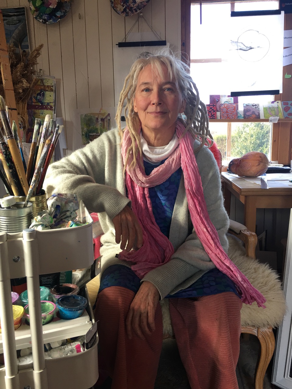 Fortfarande samma sal, ännu en skärm bort. Finns filmer som hör samman med den läkande utställningen. Jag står och tittar på mannen som flyter i det gröna, glittriga vattnet. Mitt öga glider åt vänster. Ser du? Där, längst bort i salen hänger min tavla… samma färger… samma kroppsposition… ett sånt märkligt sammanträffande. Känns som Universum leker kärleksfullt och att de båda utställningarna får förstärka varandra.utställningen finns på plats till och med 16 maj 2021. Varmt välkommen