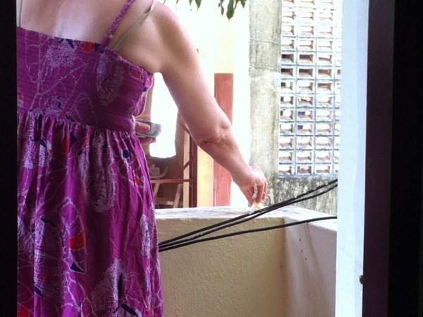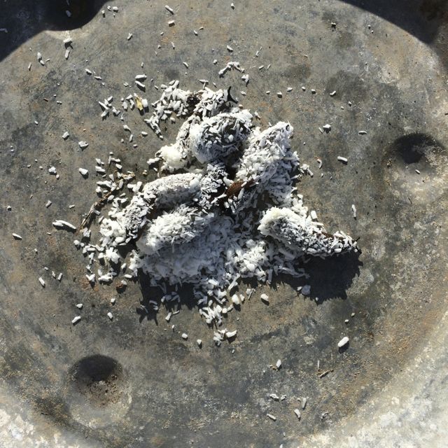 Nu utnyttjar vi detta. Lägger de inrullade sniglarna på en plåttallrik i morgonljuset. Det är fascinerande att se vad som händer. snigeln sträcker ut sig – och glider liksom ur sin kokos-kappa. Kvar ligger en liten mojsig hög som hålls ihop av snigelslemmet. Vi går in i huset och väntar nyfiket. Ska skatorna komma? Vi fick vänta …. rätt länge, men….