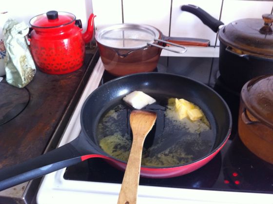 Den ska få fin färg. därefter är det dags för socker. Om man tar en del av sockret som sirap så blir den lite seg och mjukare. Till sist är det frukt och nötter som ska ner i pannan.