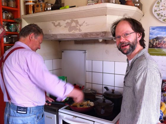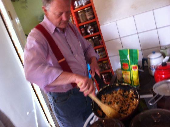 Rurik står vid spisen och trollar! Det ska bli Laddhu!!Massa fett! Kokos eller smör eller både och!!