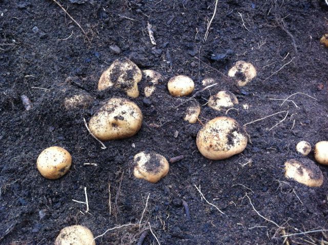 Så var det potatisen. Det finns tydligen en tradition i Sydamerika, att potatis ska sättas vid fullmåne. Hade ingen aning! Det måste vi prova! Det är ju nu så då viger vi dagen till de. Den här jordplättar förberedde Ganga i höstas. Täckt med kartong och hö. Nu var det bara att avtäcka och göra en enkel grävning. Potatis satt vid fullmåne stimuleras mer att sätta potatis, var tesen. Potatisen hade i alla fall legat och längtat länge på att komma i jorden. Hade blivit lite skrumpen, men det blir bra det med! Heja månpotatisen!