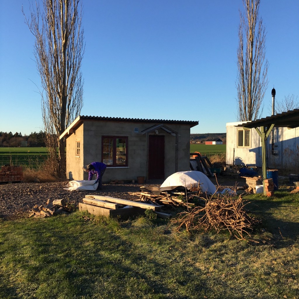 Ja, såhär långt har vi hunnit idag. Sen började det regna. Vi plastade in bygget. Imorgon ska det snöa, mest hela dagen och dagen därpå ska det blåsa rejält. Märkligt väder. Då tänker vi göra något annat och invänta bättre dagar.