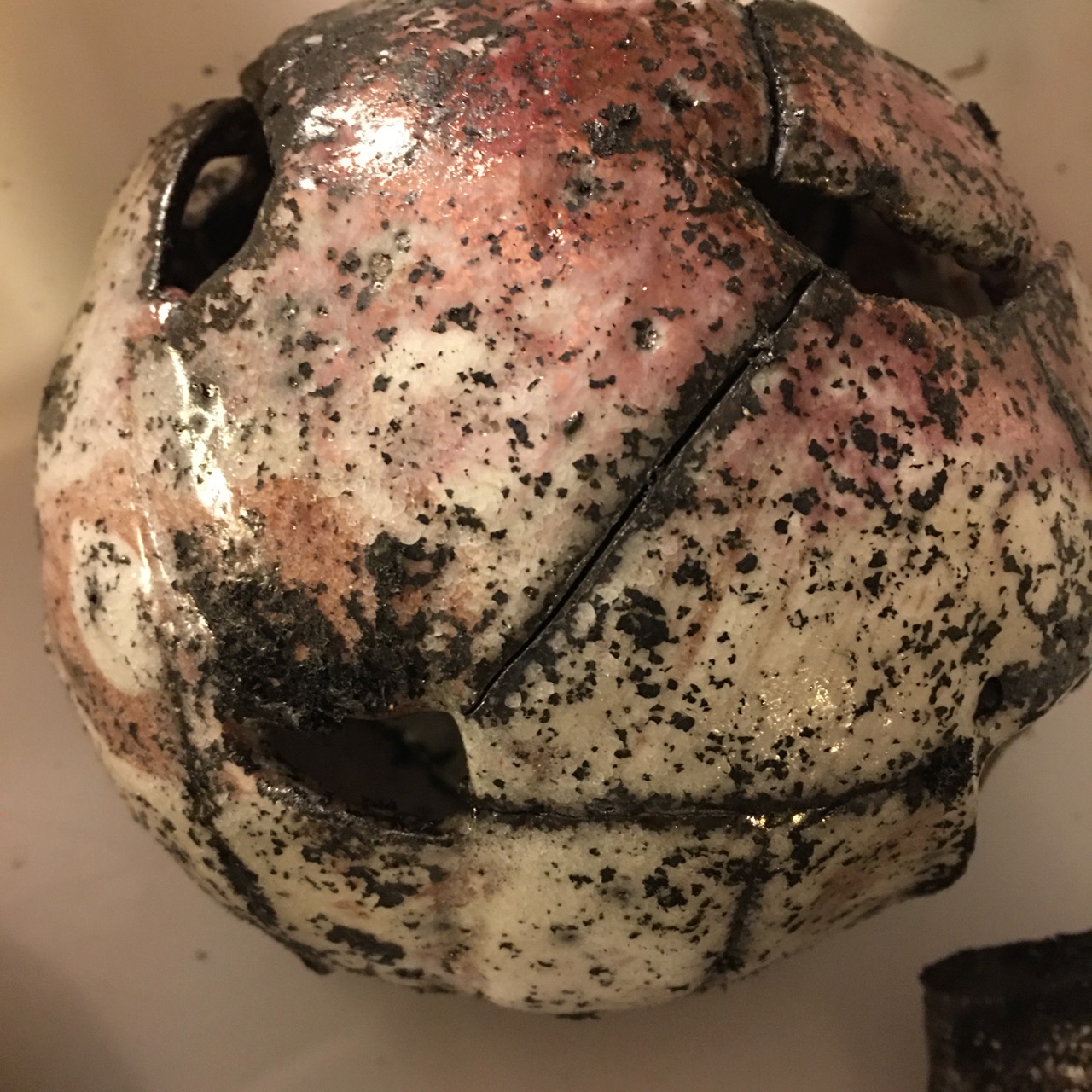 Aska och eld sprutar in på godset när det står i ugnen med glasyren lys-röd och mjuk ( 1000grader) . Det blandar sig med glasyren. Man skrubbar allt noga efter bränning, allt är täckt med sot, men det ni ser på bilderna här, är det som är stabilt i glasyren. Det var en så följsam bränning. Det var väldigt lite som gick i sönder. Glasyrerna smälte ut bra och mycket fick spännande effekter.