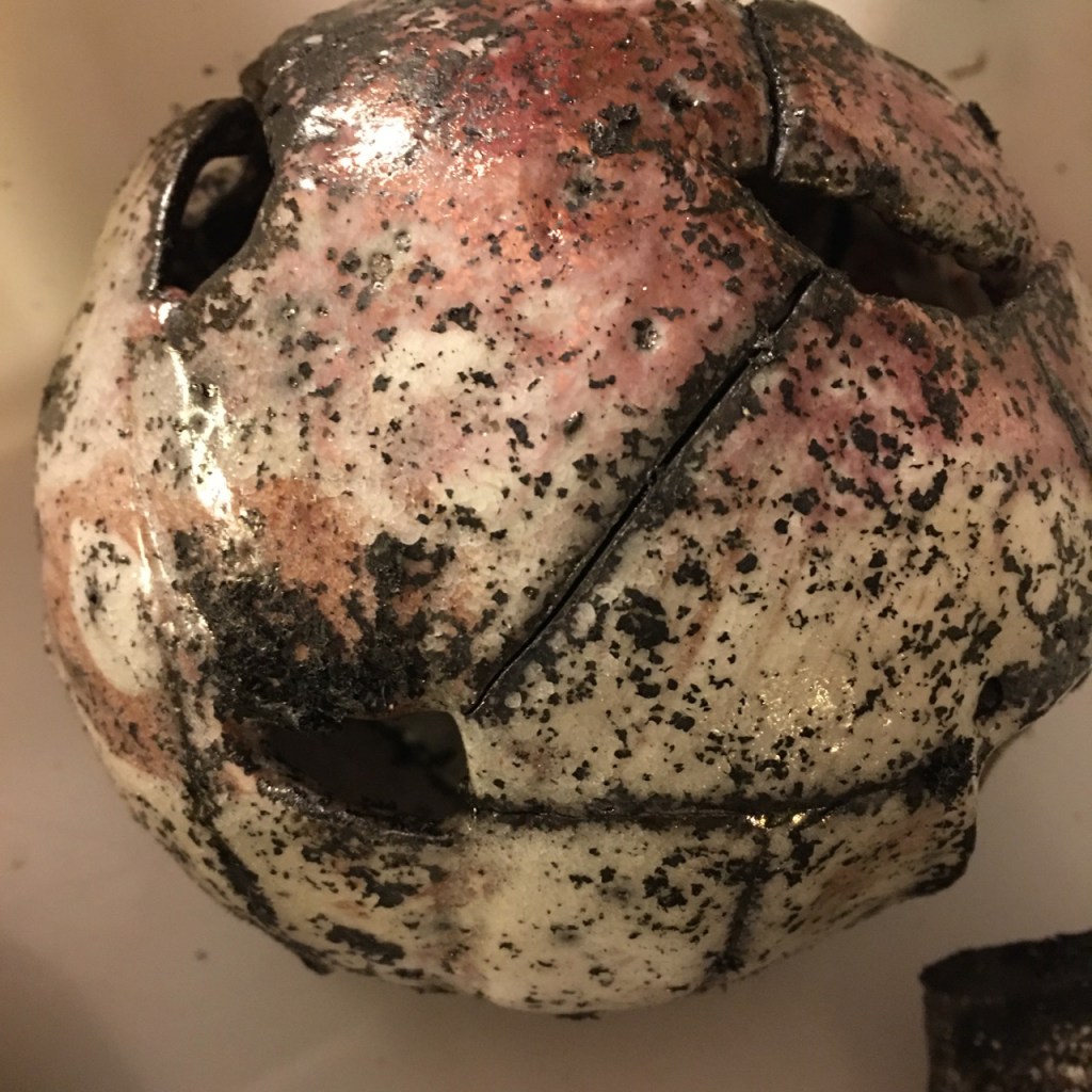 Vi fick njuta av glasyrer som man inte kan få på nåt annat sätt. Det krävs aska, eld och oberäknelighet. vår rosa rakuglasyr drog ihop sig så spännande och den mörkröda kanten i ovankanten är en kopparglasyr. I en vanlig el-ugnsbränning hade den randen snällt blivit grön, men här har det blivit en syrereduktion och då blir kopparglasyren istället röd.