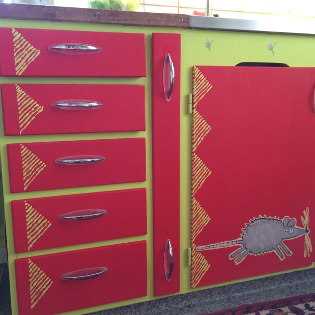 köksluckorna är röda, det är en stark kontrast mot de lysgröna väggarna. Det överbryggade vi med en bård av gröna streck i det röda, så ”gifte sig” de olika ytorna med varandra.