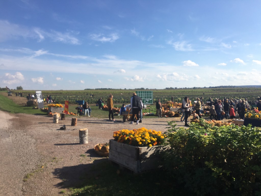 Riktigt höstfest. Det är så fint, för Hermelins , gör detta med stor omtanke. Vi känner alla att det är fest. Stora vackra arrangemang med de orange pumporna, livemusik, mat och skottkärror att låna när man ger sig ut på fälten. Gott om hjälpande personal.