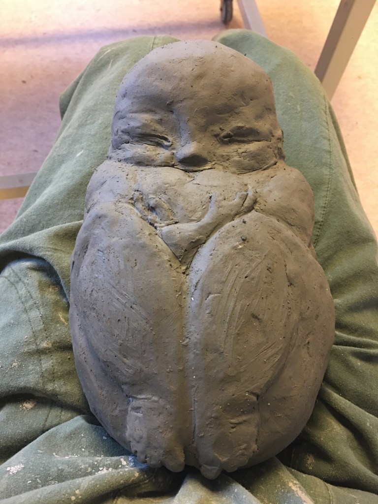 Så blev även vi klara till slut. Då hade en del redan varit tvungna att gå, så det blev inget samlingsfoto av vår grupp. Namn: Vättern, den eviga Vaginan. En hyllning till dess feminina, utsatta väsen. Men även dess starka eviga natur. Det är mycket bark med stark skogkänsla, några rosa infällningar för att påminna om det sköra sinnliga. Månen längst upp glittrar som en påminnelse om klittan.