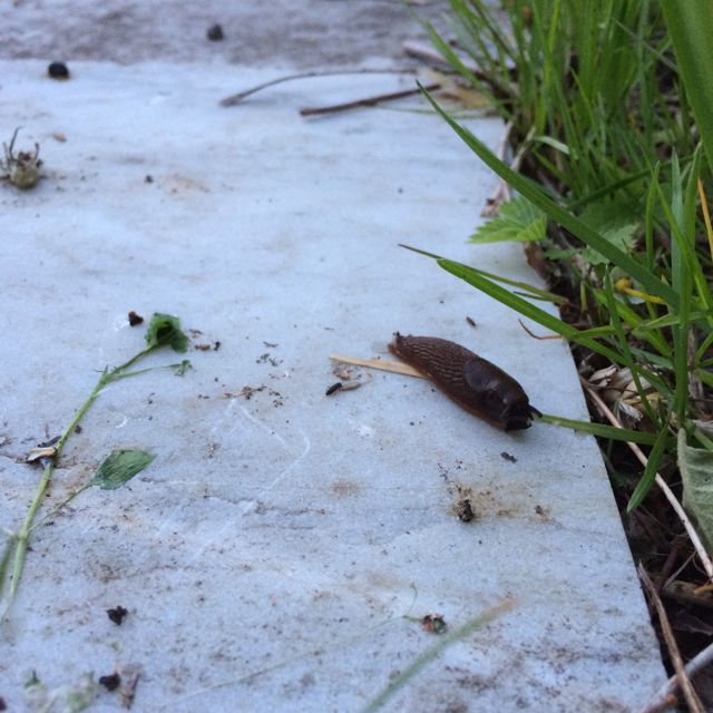 Jag ge Rurik heder för att la ut de vita marmorskivor, som vi fått, som trädgårdsgång. Sniglarnas favorit. Lite lagom varm en sval kväll och lätt att glida på…… men bäst: de syns så bra. Det är bara att trampa på.