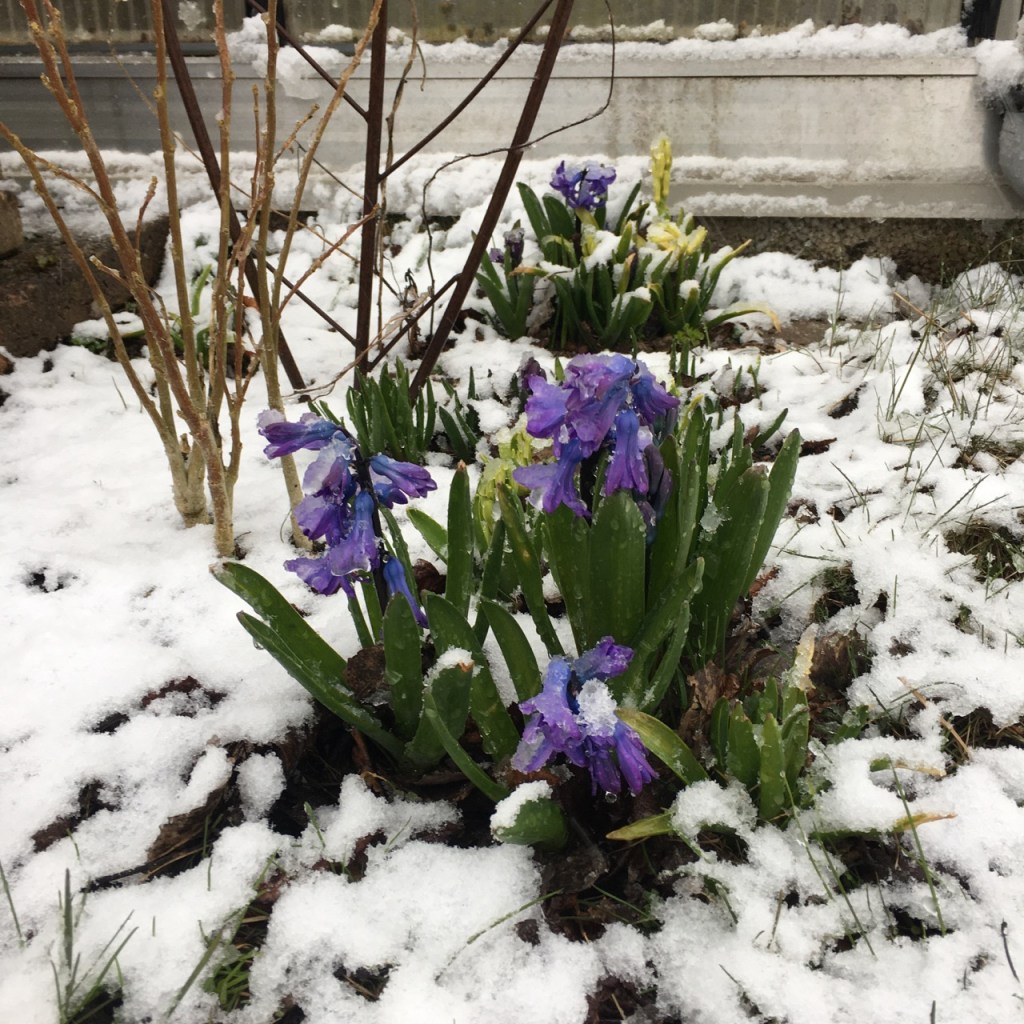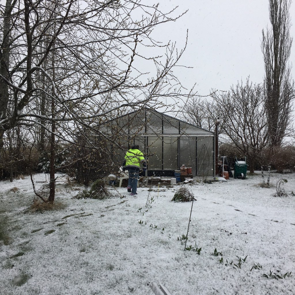 Bara nån timma senare, såg det ut såhär. Vädret är lynnigt. Snön vräkte ner och blåste rejält. Blommorna huttrar i rabatterna, de som slagit ut. Vi kryper in i soffan och tänder en brasa och hoppas att våra persikor har det bra, där de hänger ovan ljusen, ute i växthuset.