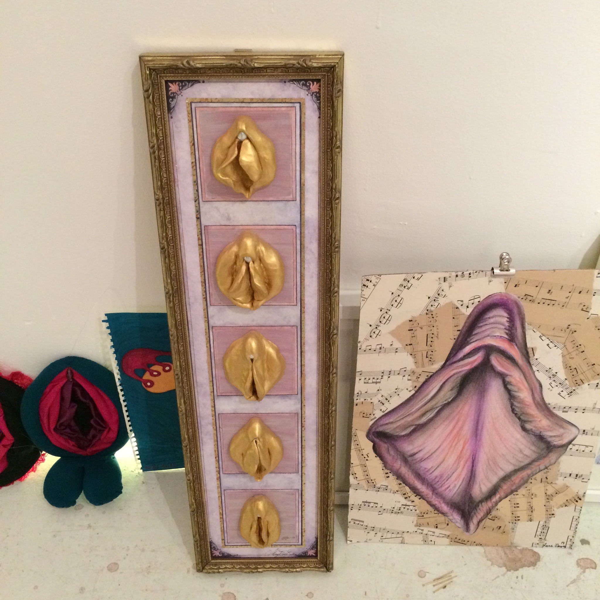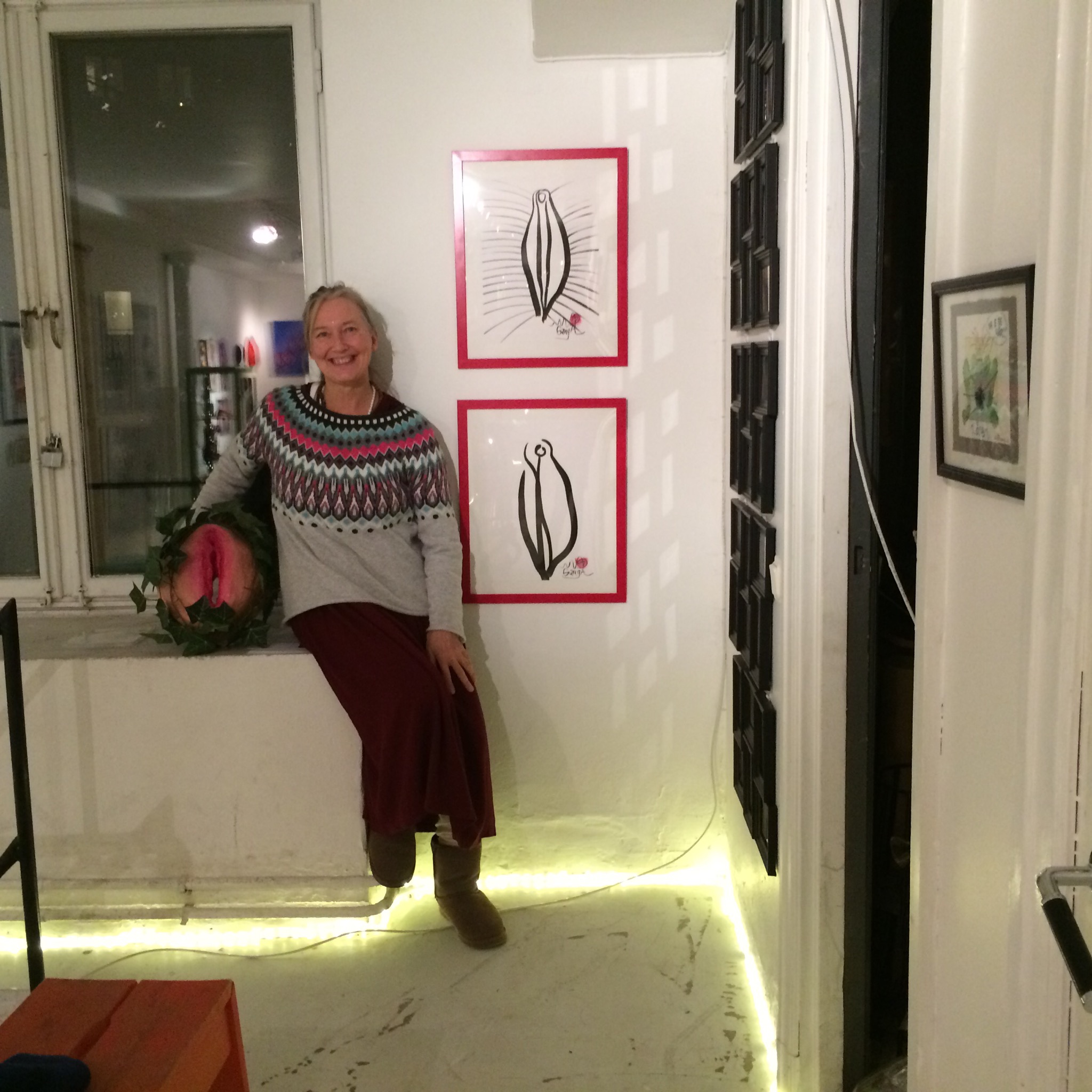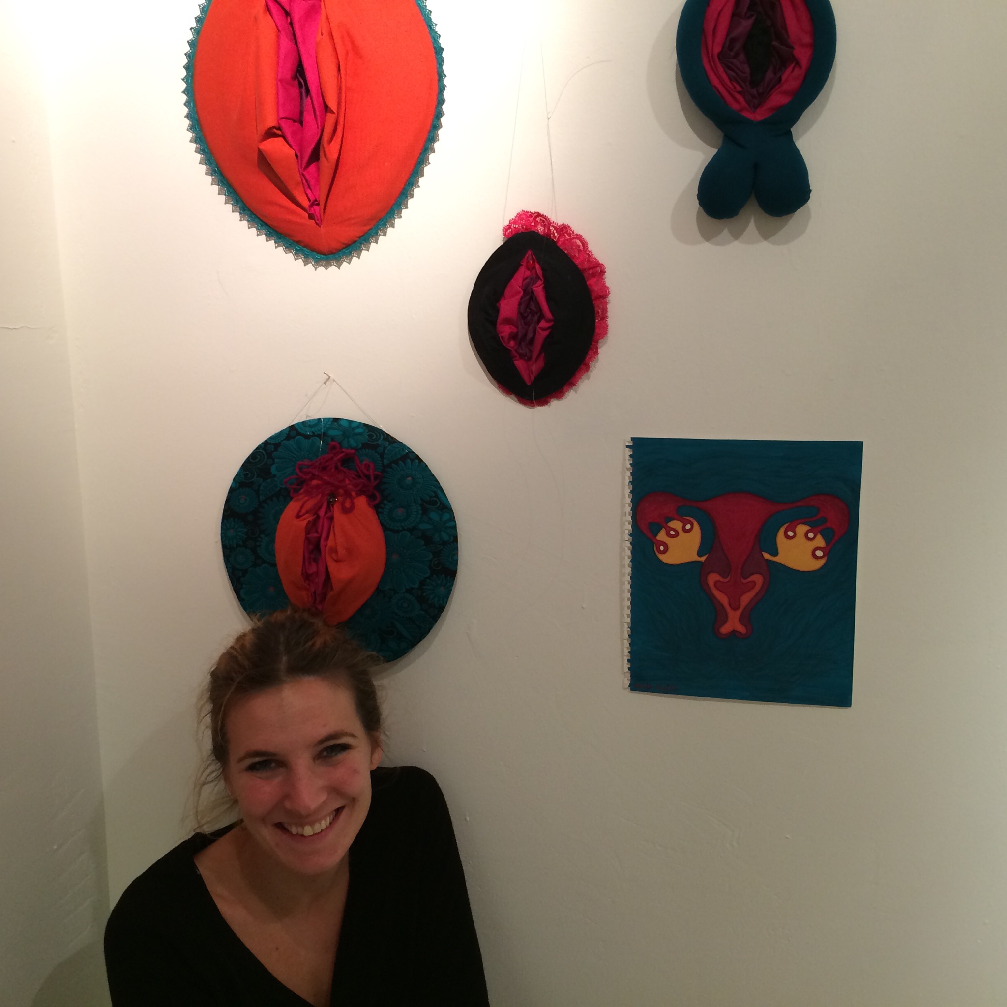 Sara-Lo jobbar i tyg. Förutom de vackra vägg-fittorna så har hon skapat en installation i källaren. Ett stilla rum, ett Yoni-rum där man möter det Universum som fittan bär inom sig.