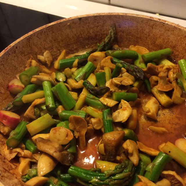 Sparrisen och svampen gosar omkring i pannan. Ni skulle känna doften! ”lite svart salt, ja, kanske peppar, lite SYRA! Hur får jag det? Aha torkad Mango-pulver.