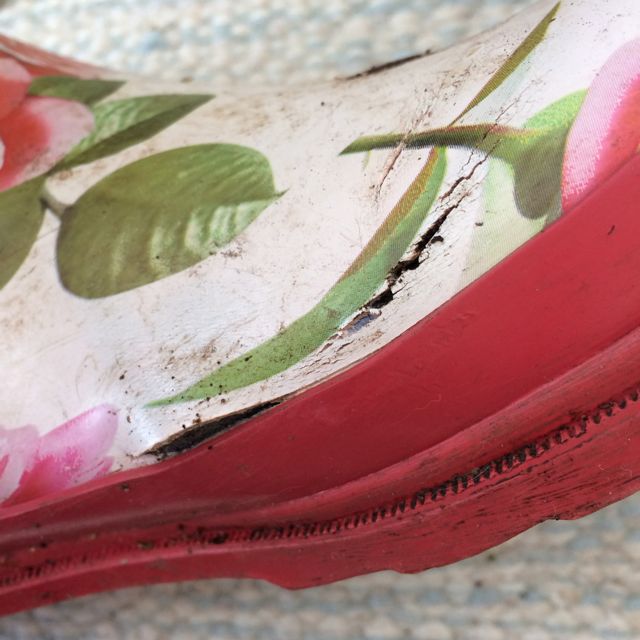 Efter ett halvår, var där hål. Jag reklamerade dom och fick ett nytt par -som jag inte iheller har haft speciellt länge….. hål igen!! ”Mina röda stövlar från Tre Torn hade jag i tjugo år!!” Gnällde jag för min dotter som står i skobutik.
