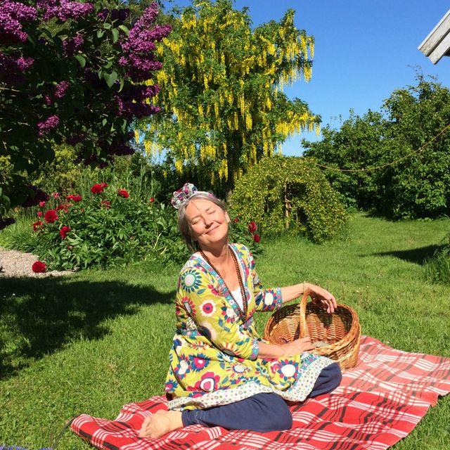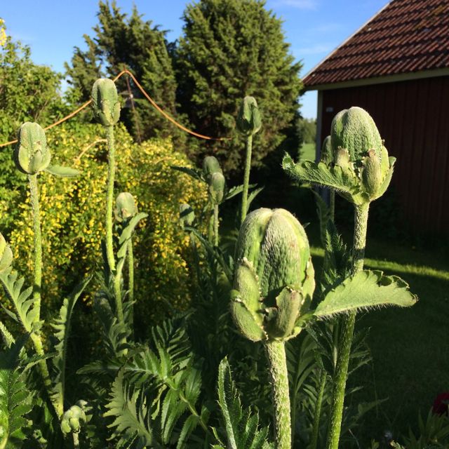Nu är vi på Omberg. Vi är med i ett matlag som handlar eko tillsammans. Vi är här för att hämta varor. Men, inte vill man ha för bråttom. Det är en gammal gård, även om boningshuset är från början av 1900-tal, så är det onekligen antik mark. Ser du den gigantiska busken till höger om Rurik och Rune? Det är en syren. Den tillhör de äldsta som finns i Sverige.