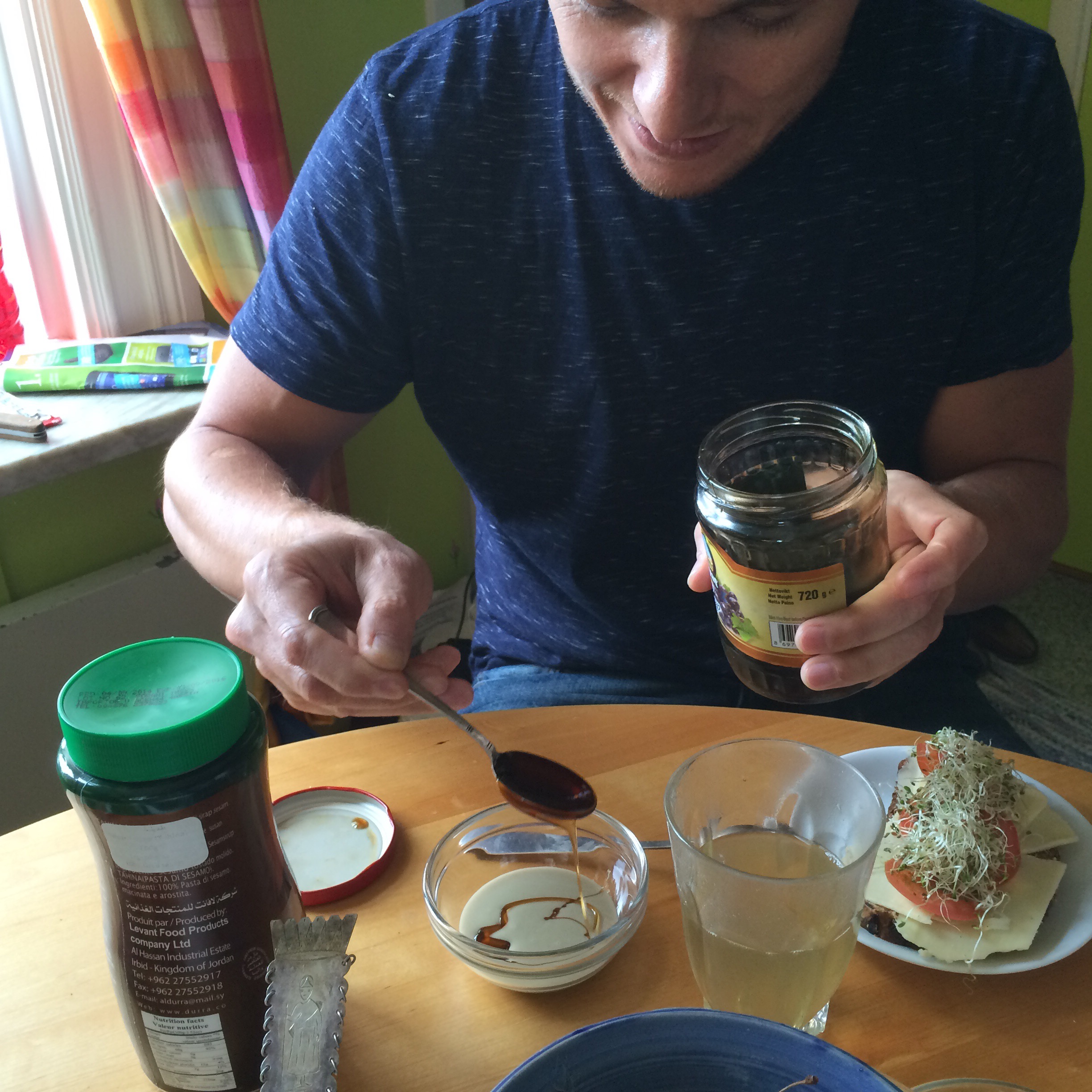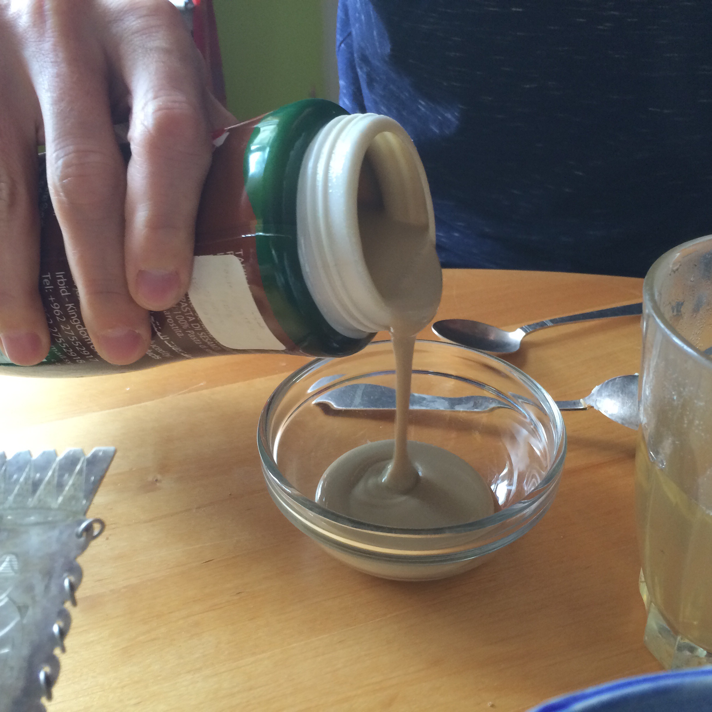 Sen hittade jag den i form av pasta, på hyllan i mellanösternbutiker som Tahin. Tyckte mest det var en torr känsla som spred sig i munnen. Men det var då det! Annat är det nu!Rurik visste ju precis hur man ska trixa med Tahin! Häll upp lite i en skål och häll sedan i lite vatten och rör om. Sen tillsätter man lite citron o kryddor och vips har man ett fint pålägg eller sås – som även blivit mer lättsmält av förädlingen.