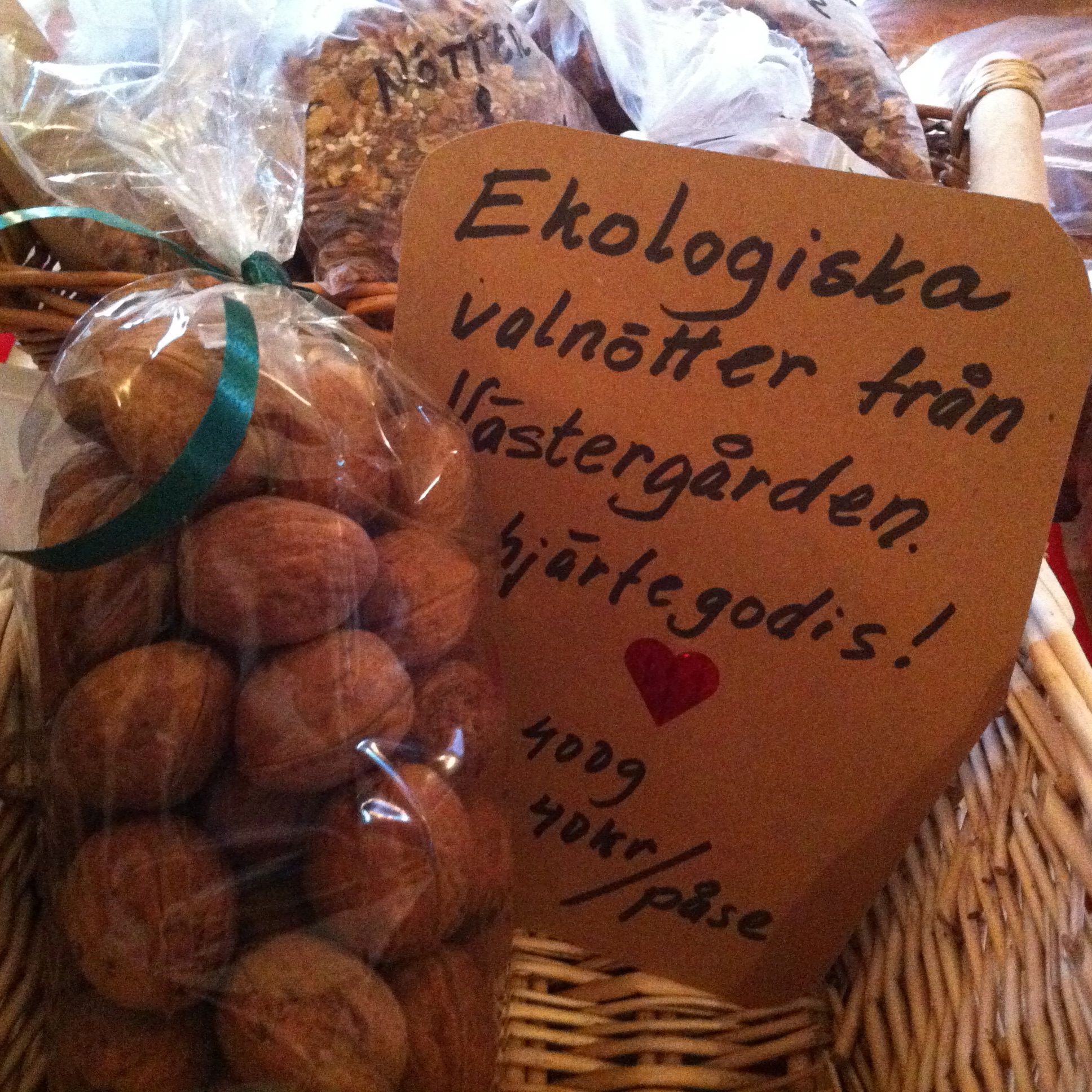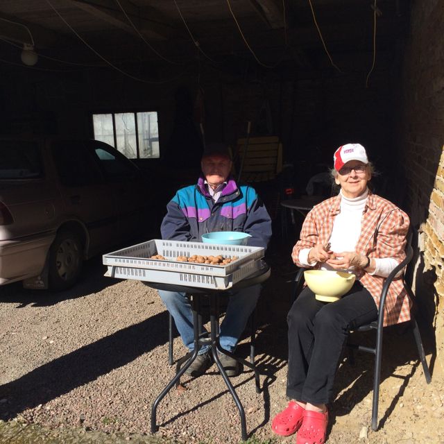 Vi snokar rätt på varenda valnöt och till sist kan vi stolt överräcka skörden. Far är född snabb, inte så ofta man hinner hjälpa till, faktiskt. Men nu hann vi o far e glad.