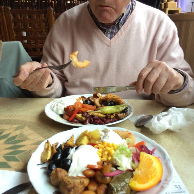 ”Jag är vegeterian”, säger ägarn. Det brukar behöva vara så, för att det ska bli klass på det vegetariska. Men här finns även kötträtter att lägga till, för den som så vill. Vi äter oss mer än mätta på olika grönsaksröror med fina, för oss nya smaker, bönor, oliver och yoghurt. Mjuk fin klassisk musik i bakgrunden gör oss lite förundrade. Var är vi egentligen?